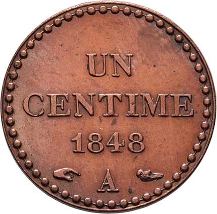 | 2165. | Centime 1848 A, Paříž, KM.754 (bronz), 1.996g, pěkná