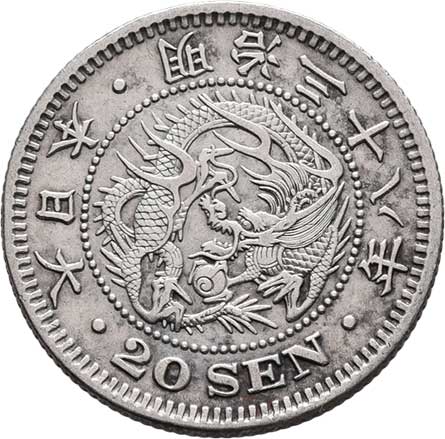 | 2574. | 20 Sen, rok 7 (= 1874), Y.24 (Ag800), 5.368g,