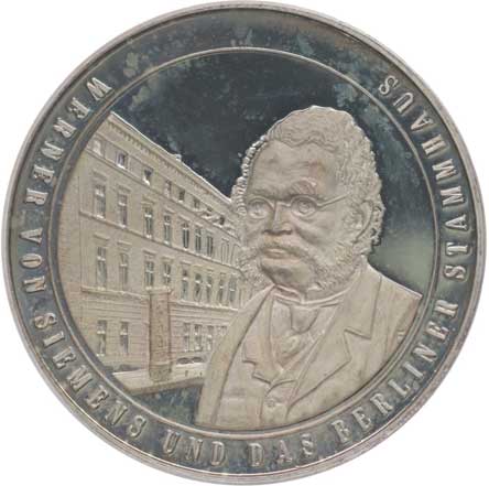 Poprsí Wernera v.Siemens a budovy Stammhaus, opis / korunovaný znak mětsa, vročení, opis, Punc.900, Ag 40 mm, 20,1 g |