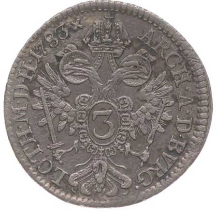 637. 3 Krejcar 1783 A, Vídeň, P.34, He.332, J.6 R! 2/1 2400,- --.-