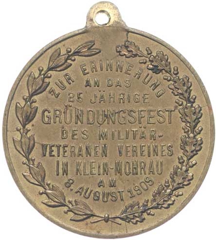 spolku vojenských veteránů 8.8.1909, vojenské atributy ve věnci /