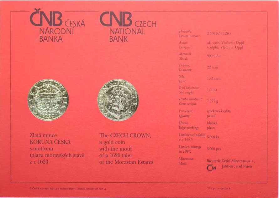 1462. Karta (certifikát) pro minci 2500 Kč 1997 - tolar Moravských stavů N 300,- --.-