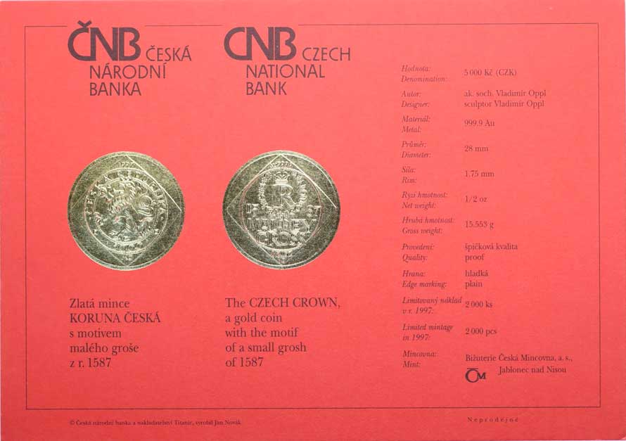 1463. Karta (certifikát) pro minci 5000 Kč 1997 - malý groš N 300,- --.-