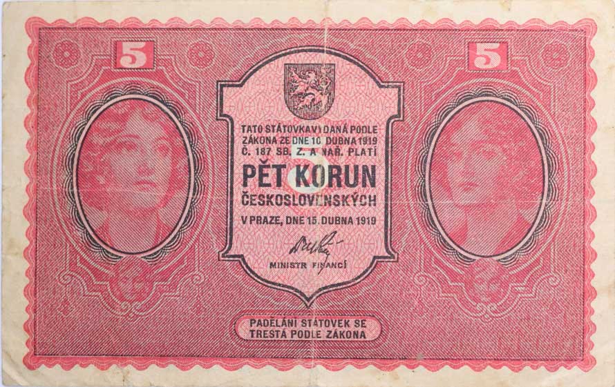 5 Kč 1919, série 0121, B.8, Hejzl.8a 3x natrž., odřený tisk "neperf." |
