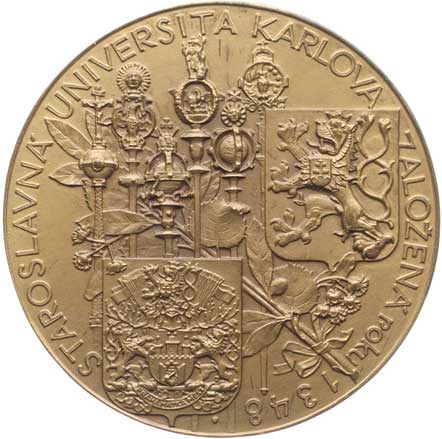 Znaky Prahy a ČSR, v pozadí univ.insigie, opis / klečící Karel IV.
