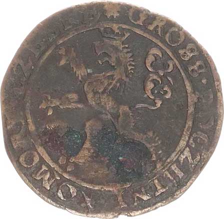 | 475. | Měděný peníz (flůtek), se lvem a čtyřrázem