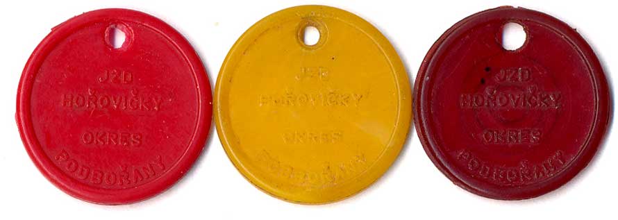 | 1215. | JZD Hořovičky okres Podbořany, červená, žlutá, vínová, UH25, 3ks | 1-1- | 50,- | --.- |
