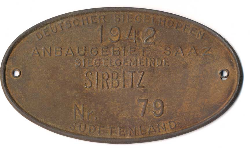 Sudetenland (Sudety Žatec Sýrovice, pečetící známka na 1 cent chmele), lisovaný plechový ovál 138x78 mm, prášková koroze |